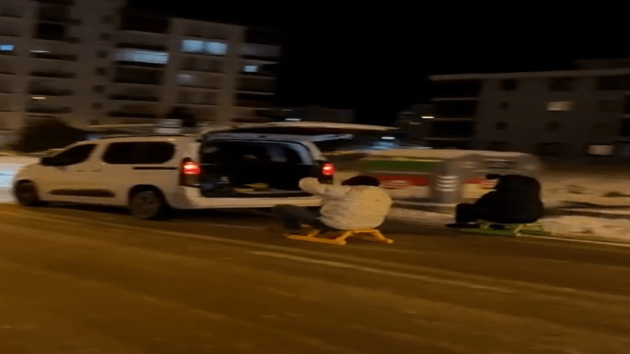 İlkadım ilçesi Baruthane Mahallesi’nde dün saat 23.00 sıralarında 2 çocuk, trafiğe açık yolda hafif ticari aracın arkasına bağladıkları kızaklarla kaymaya başladı.